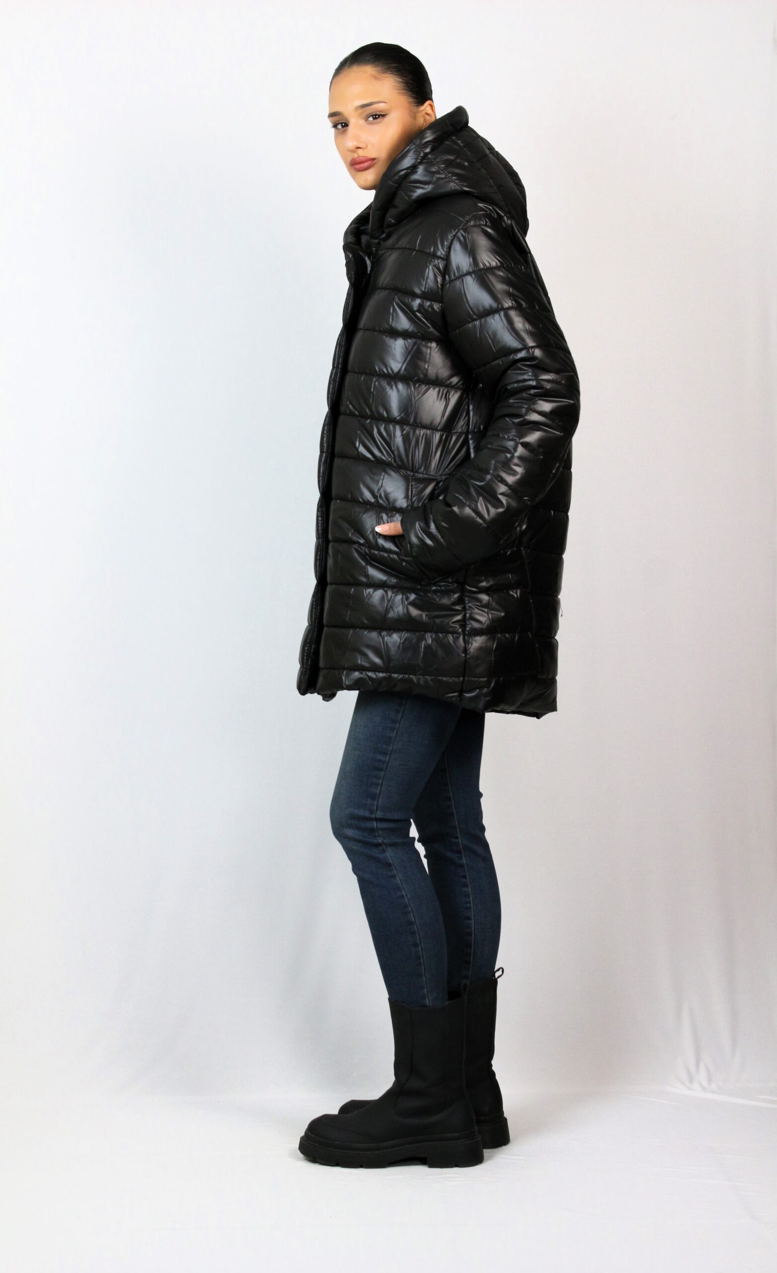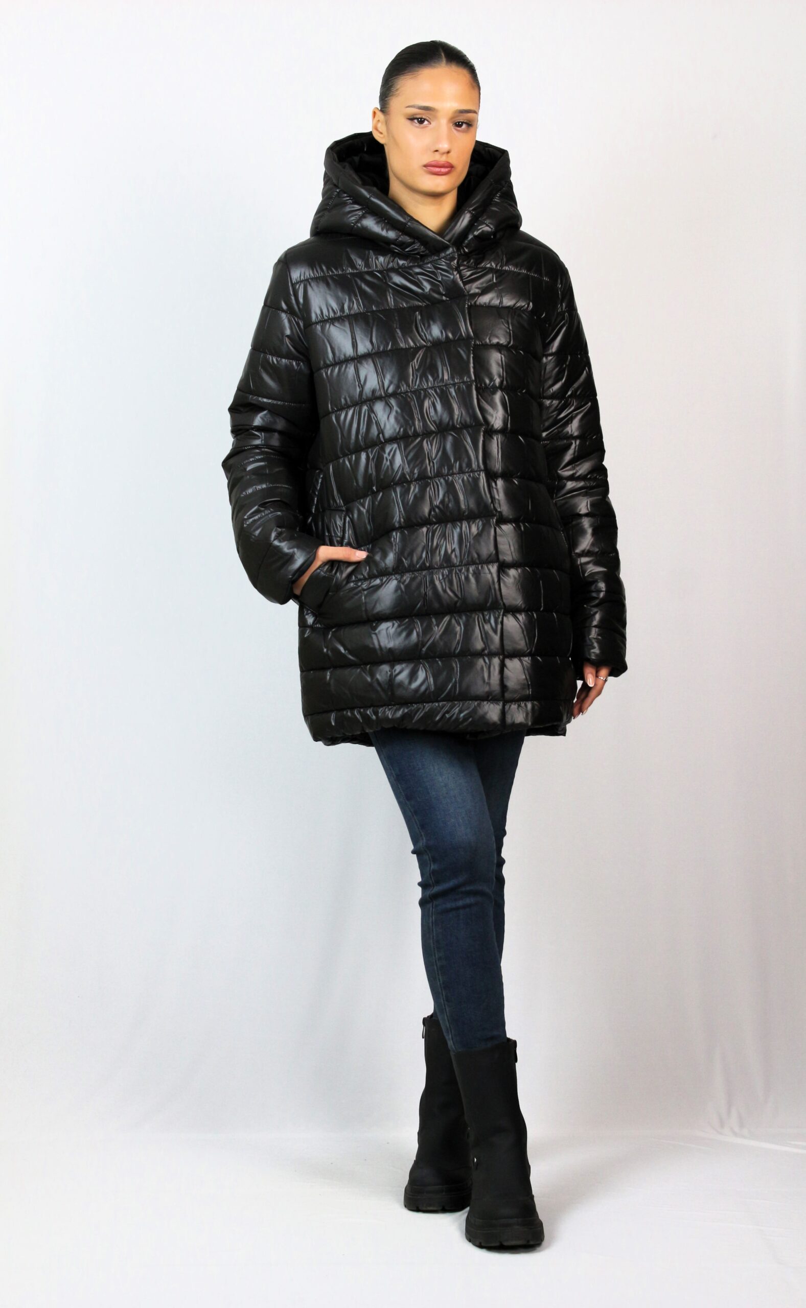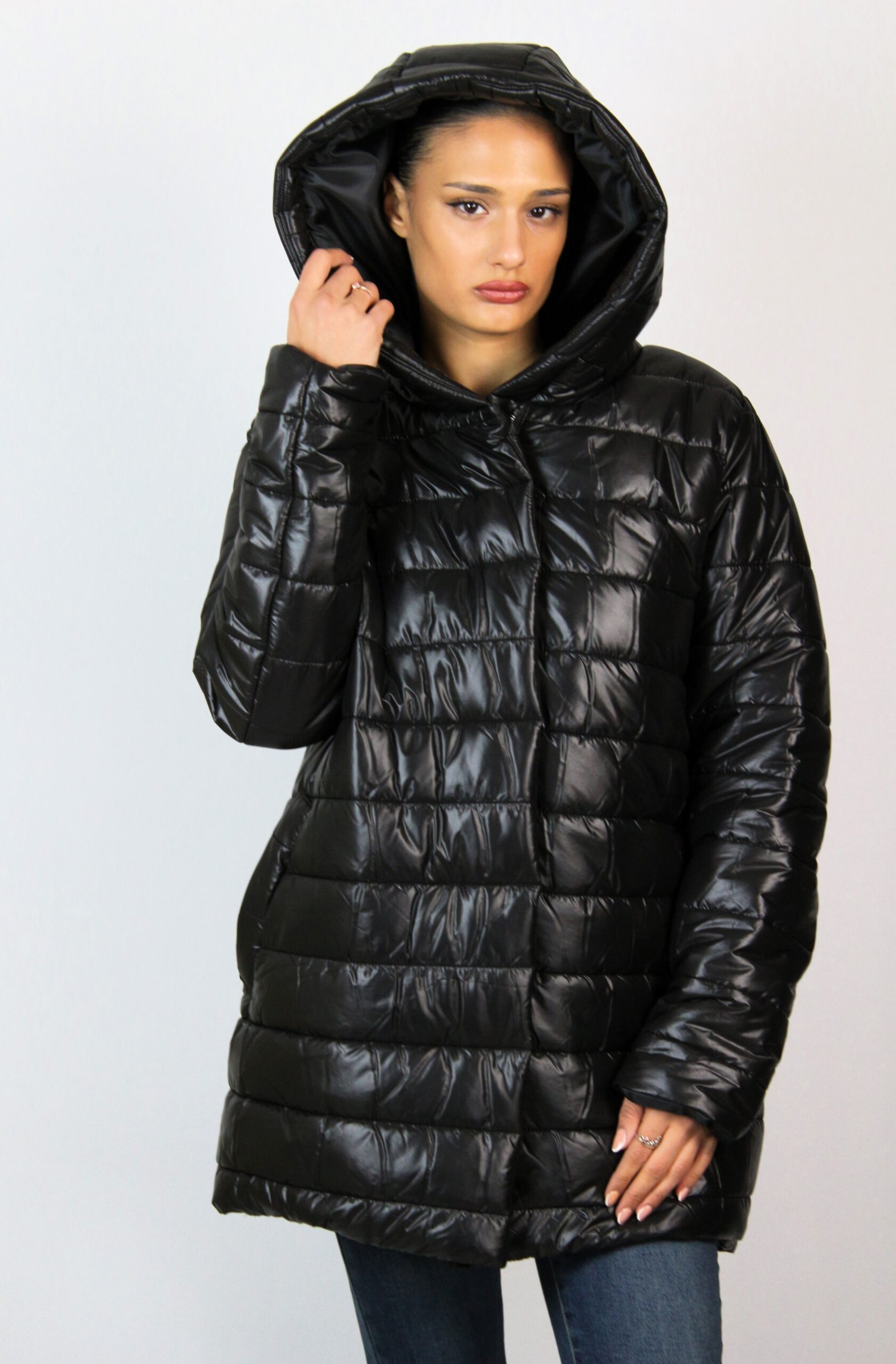Капитонироно яке средна дължина с два джоба с филетки и качулка тип шал яка, която не се сваля. Закопчава се с цип, има хастар. Леко и удобно предложение за вашия гардероб, подходящо за зимата.