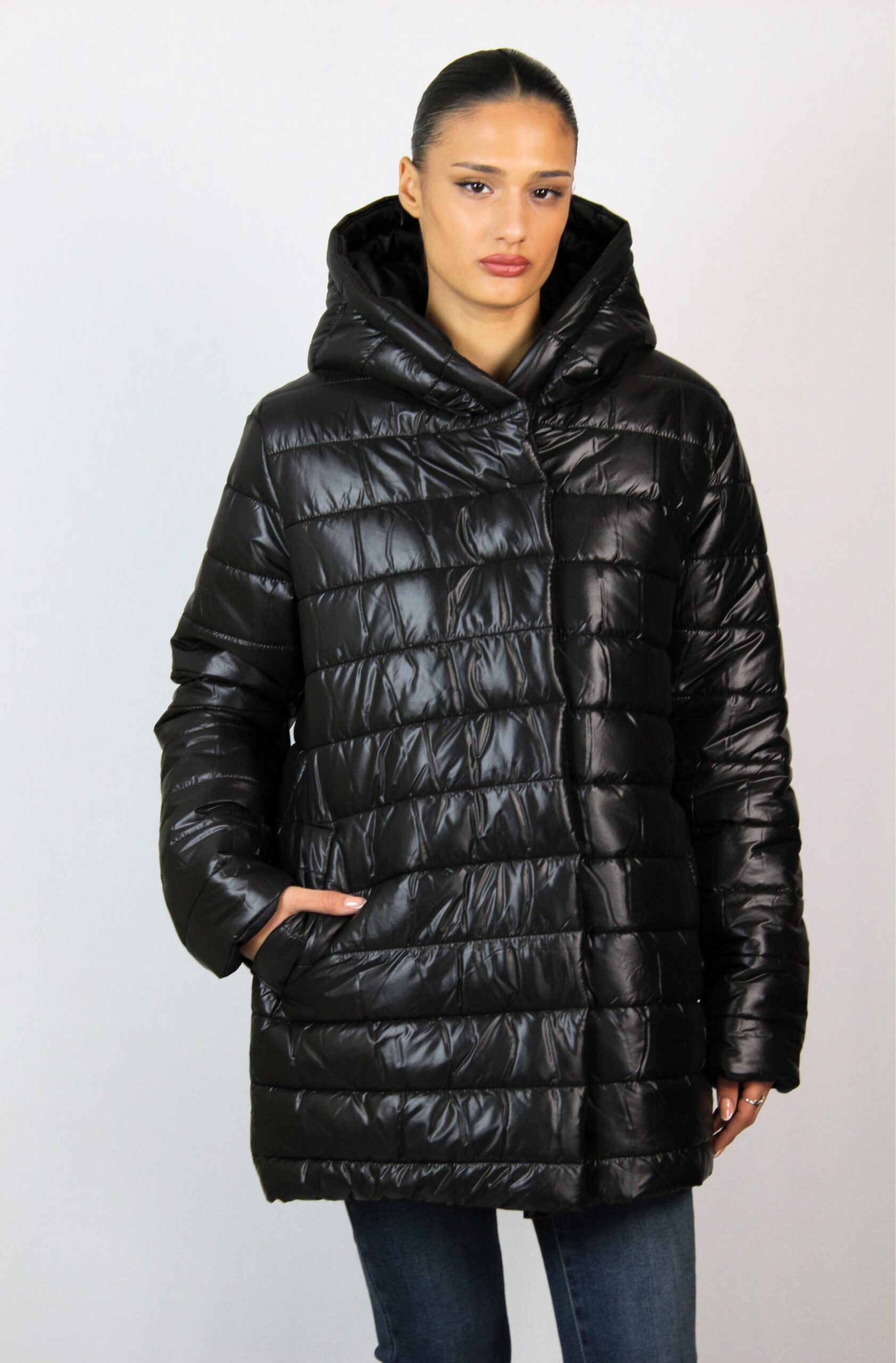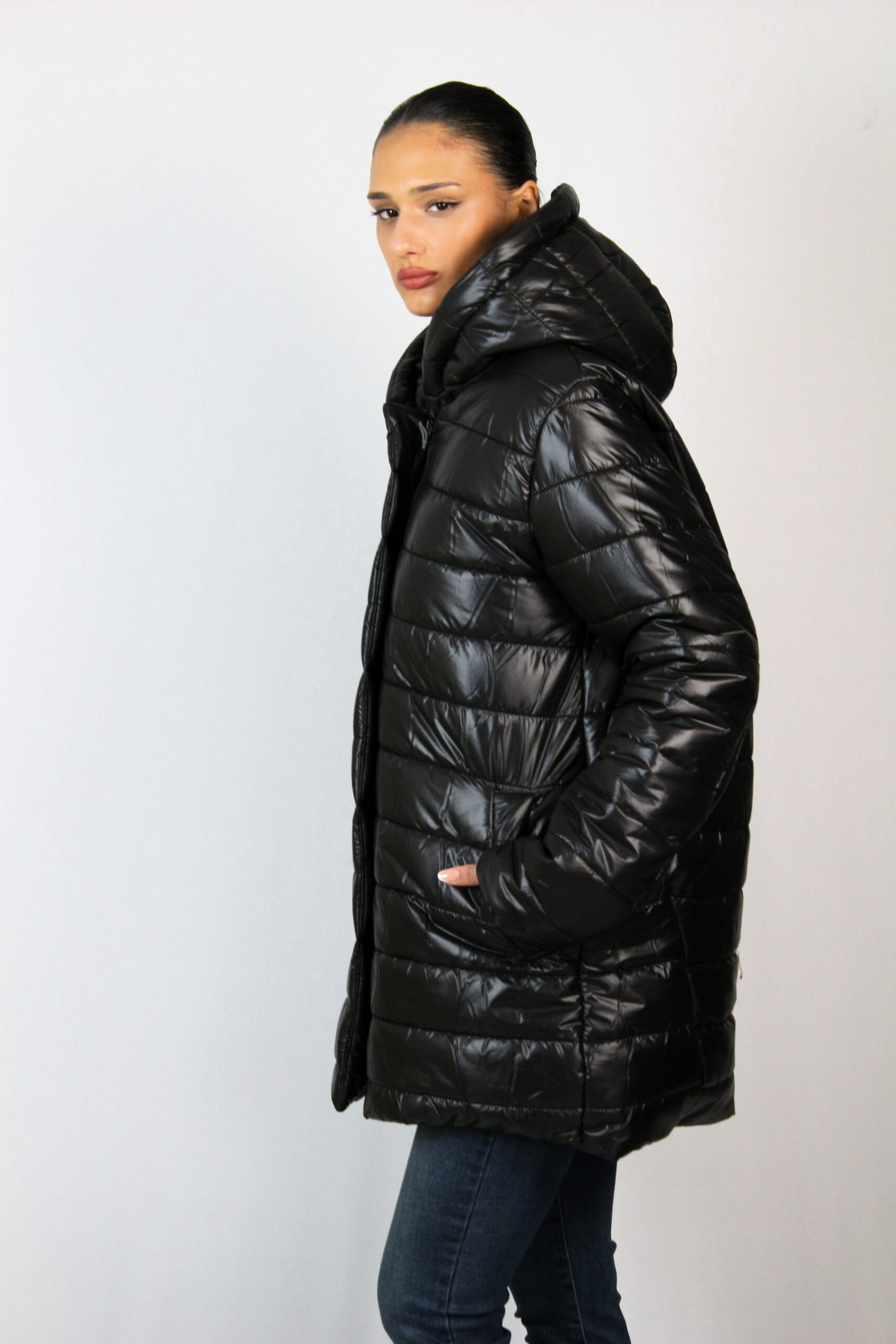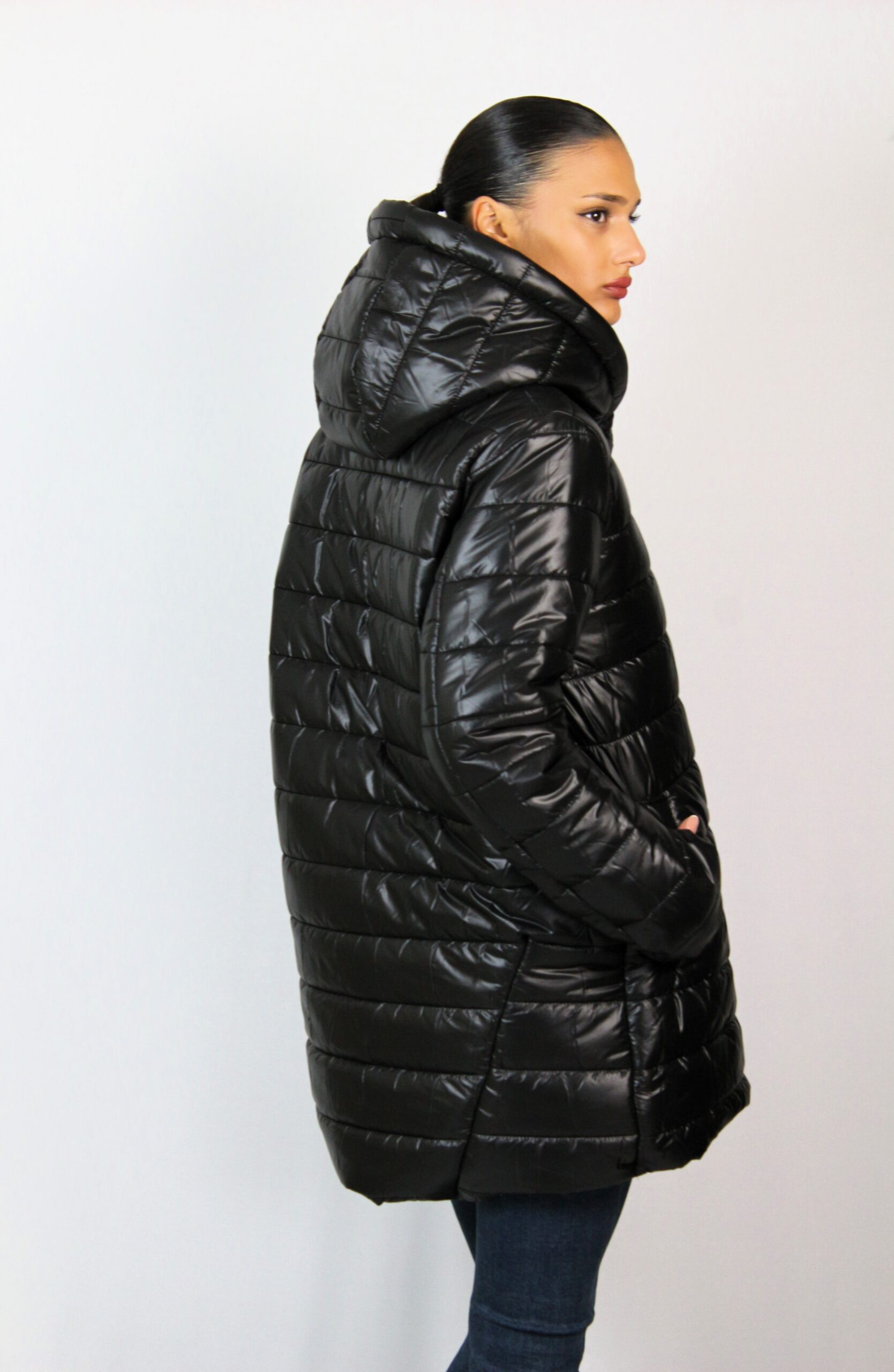 Капитонироно яке средна дължина с два джоба с филетки и качулка тип шал яка, която не се сваля. Закопчава се с цип, има хастар. Леко и удобно предложение за вашия гардероб, подходящо за зимата.