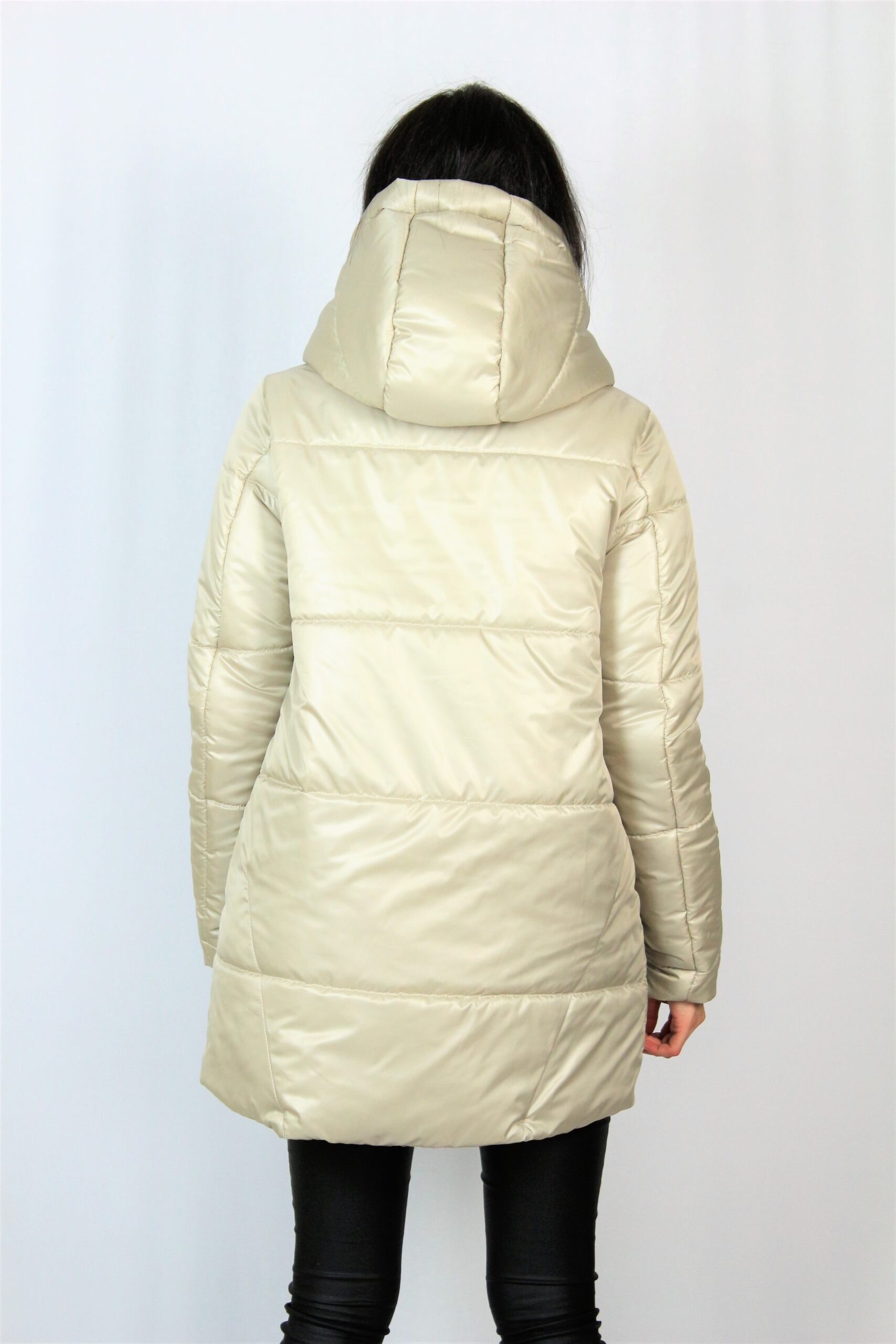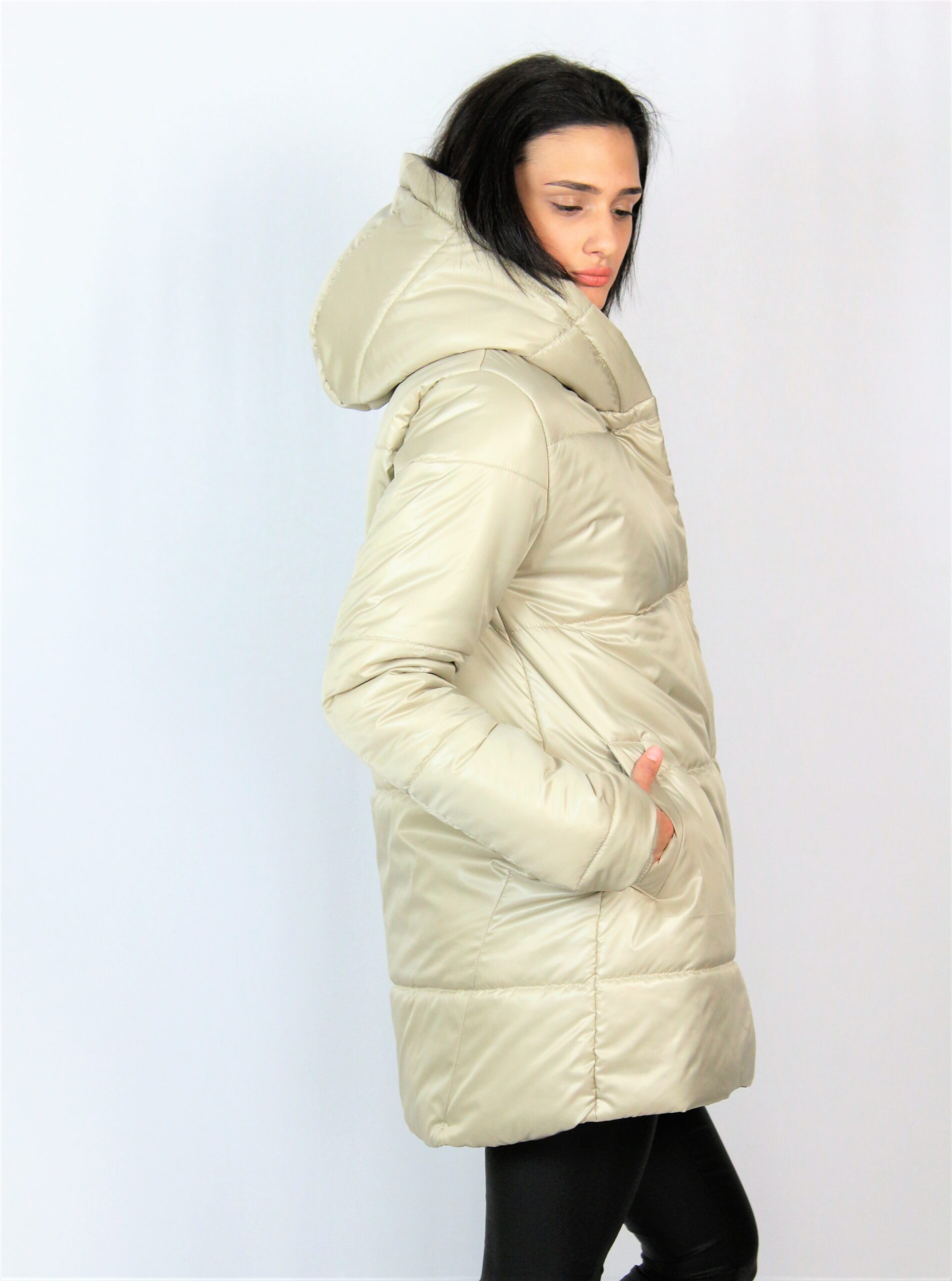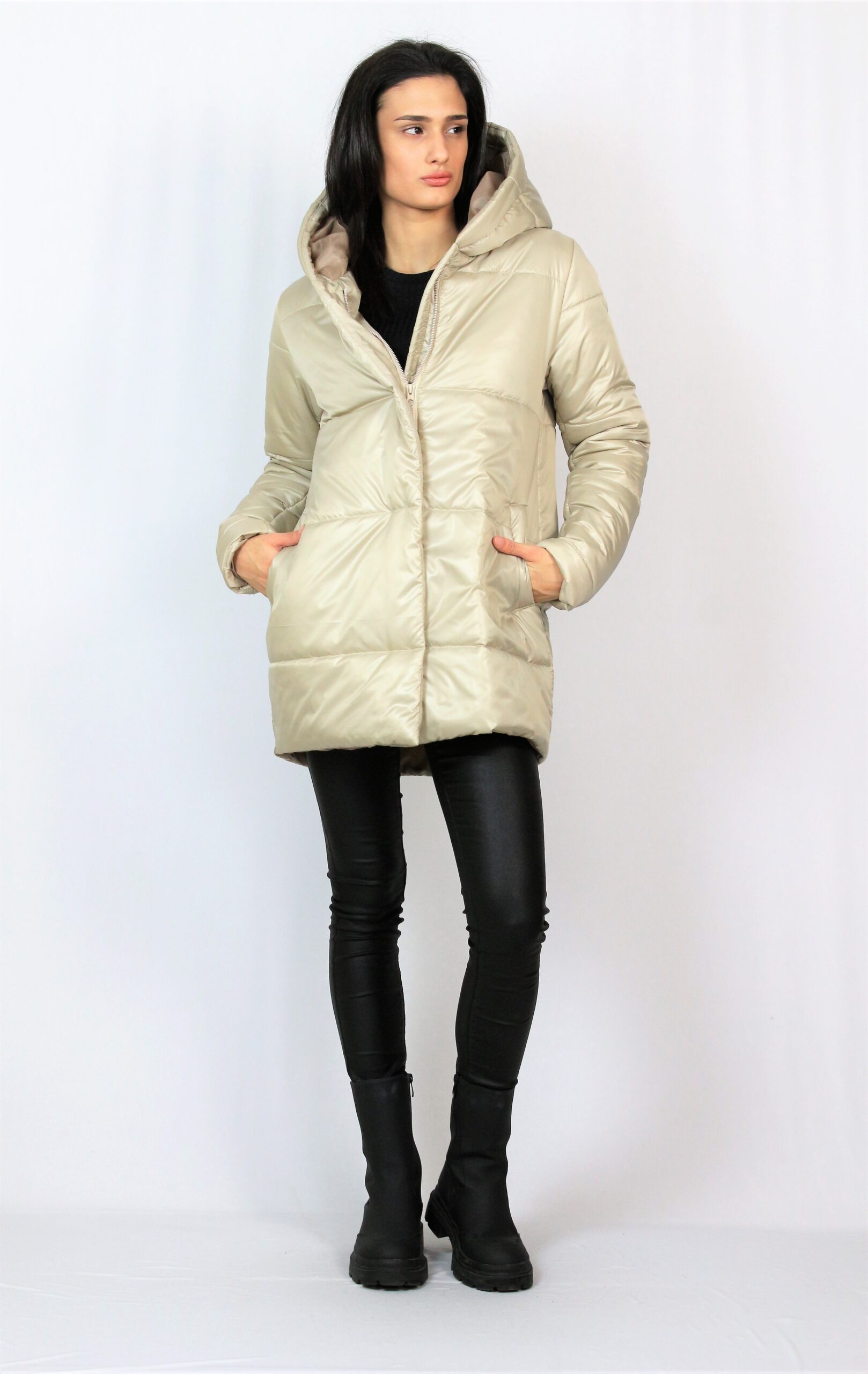 Ватирано яке средна дължина с два джоба и качулка тип шал яка, която не се сваля. Закопчава се с цип. Леко и удобно предложение за вашия гардероб, подходящо за зимата.