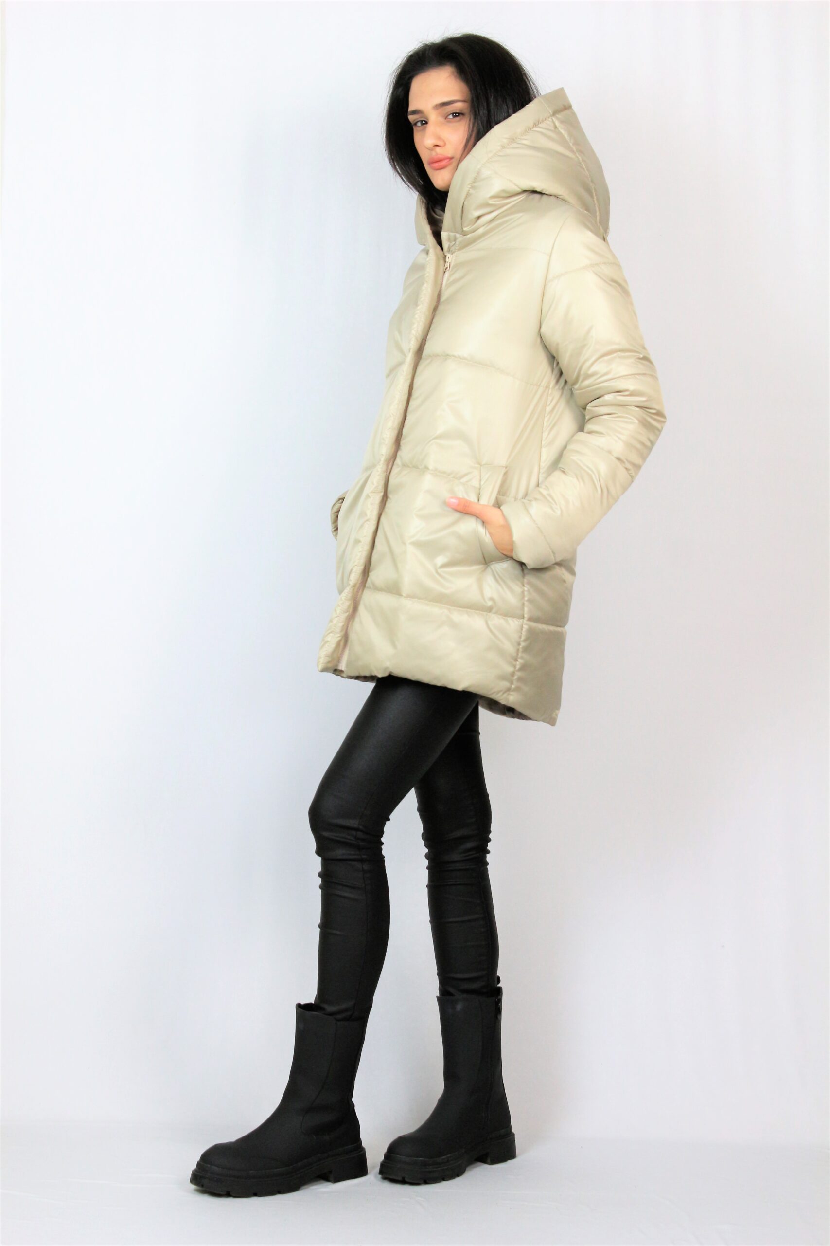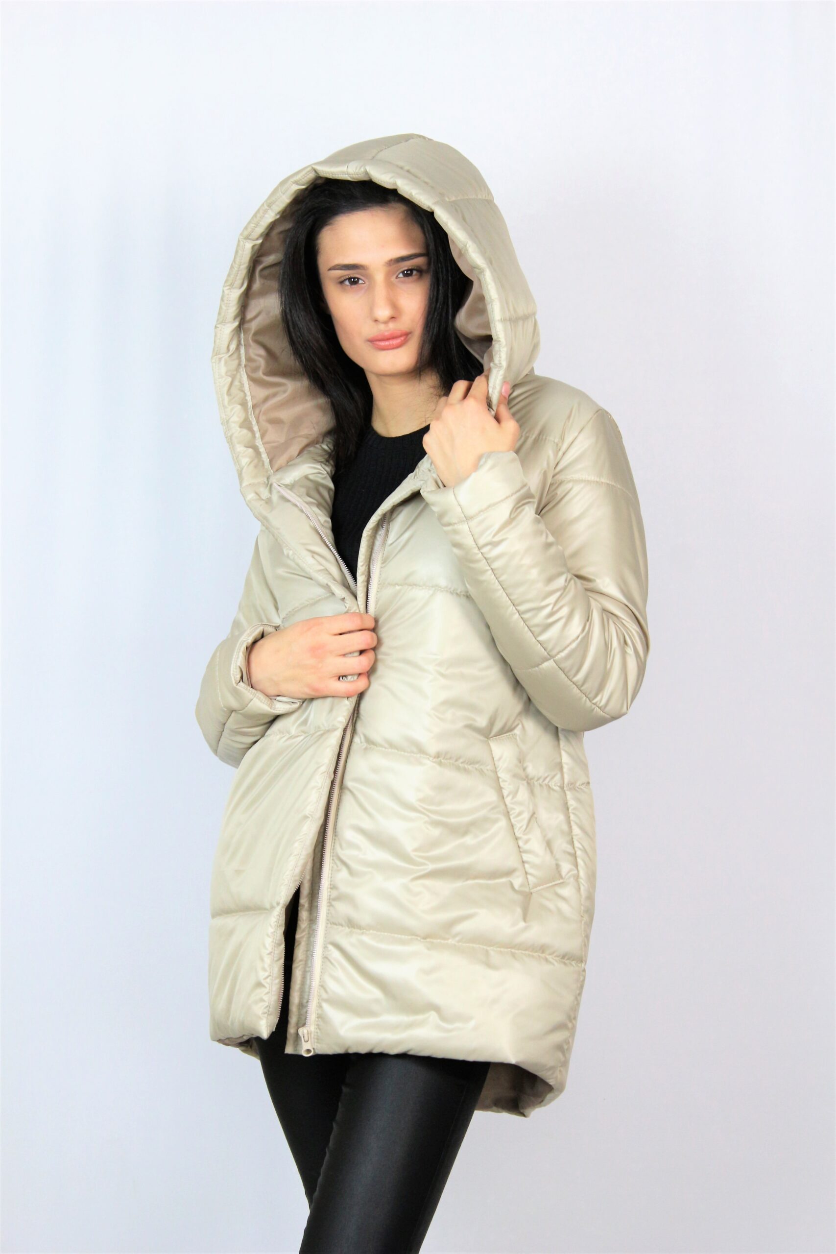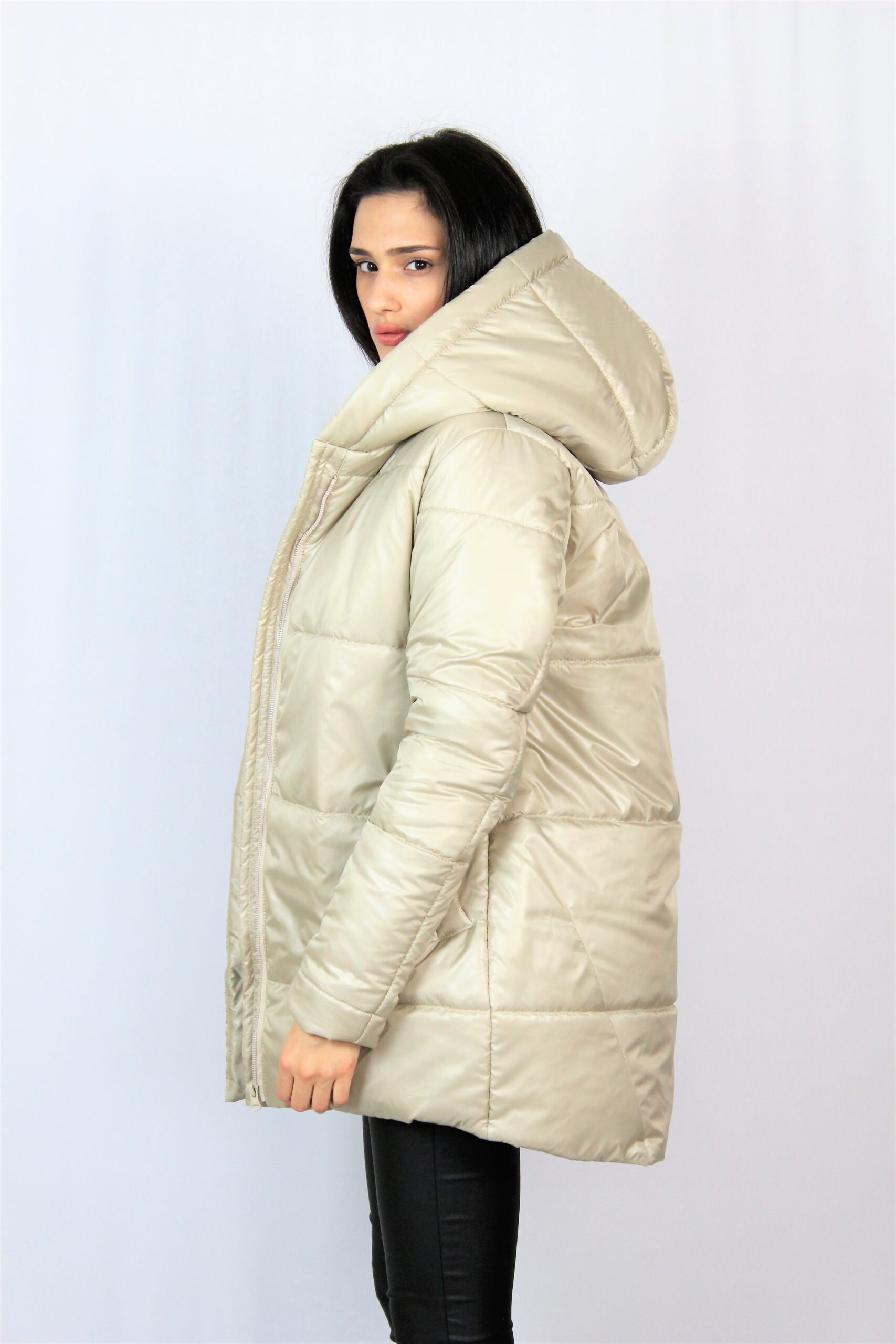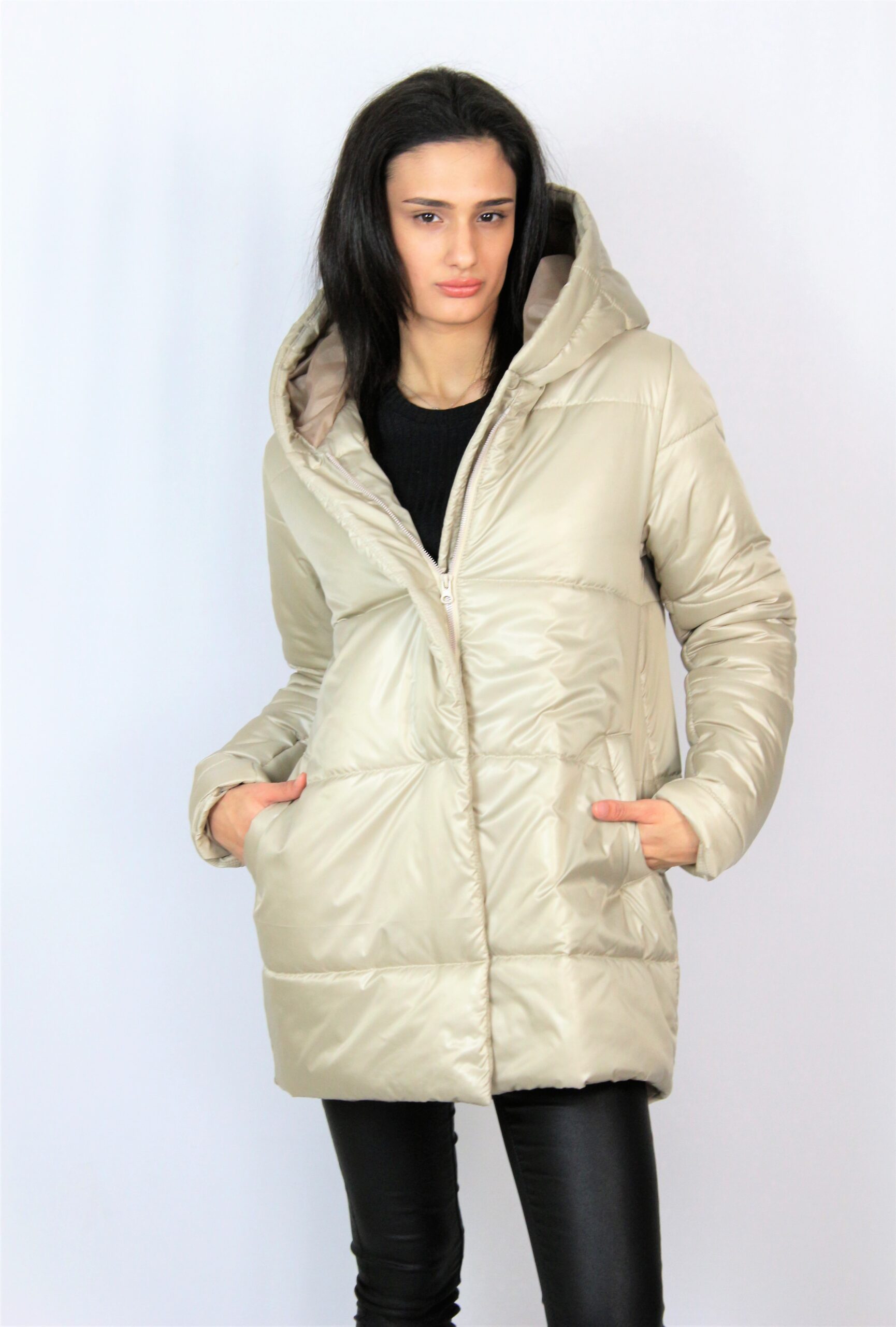 Ватирано яке средна дължина с два джоба и качулка тип шал яка, която не се сваля. Закопчава се с цип. Леко и удобно предложение за вашия гардероб, подходящо за зимата.