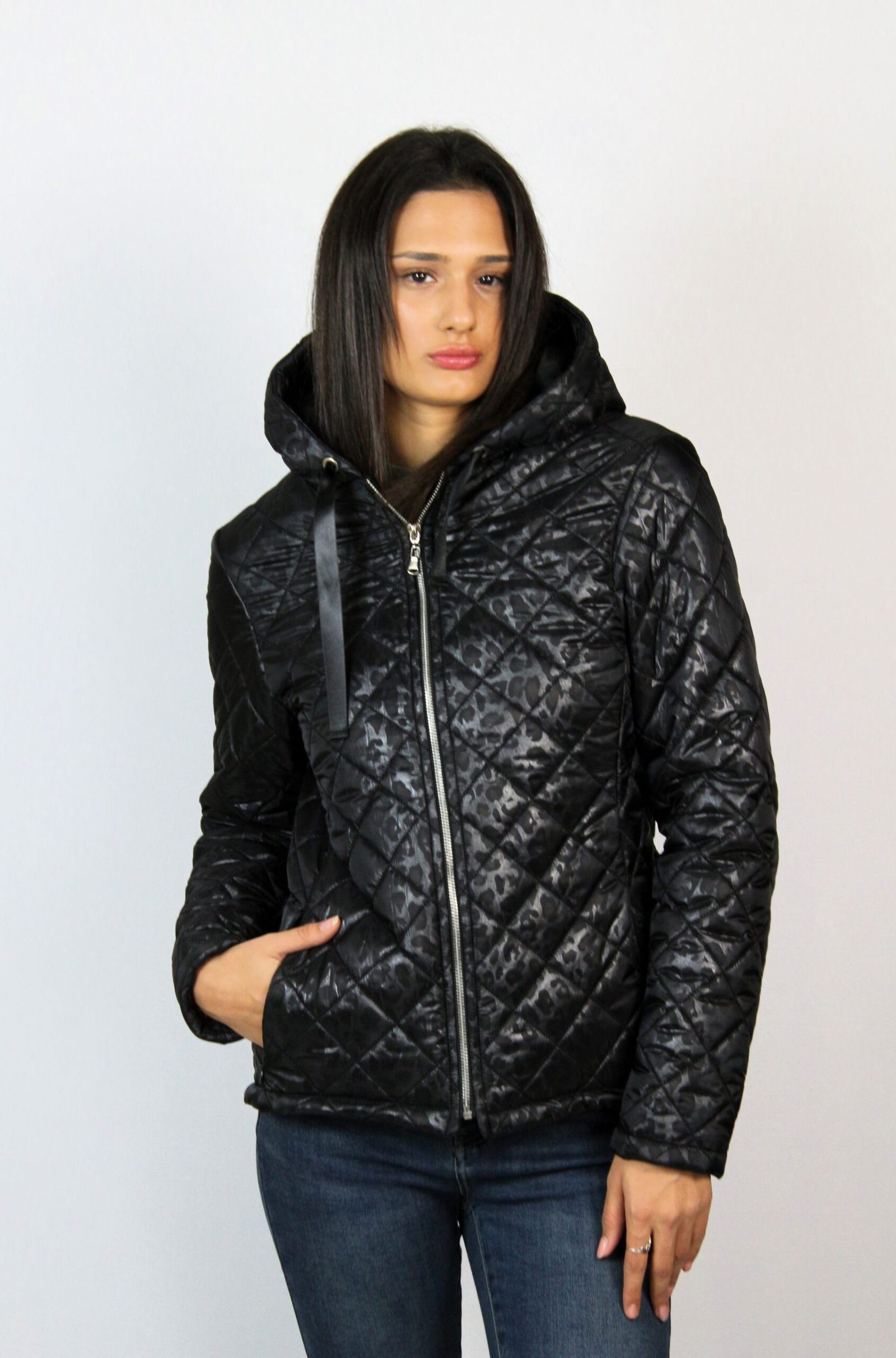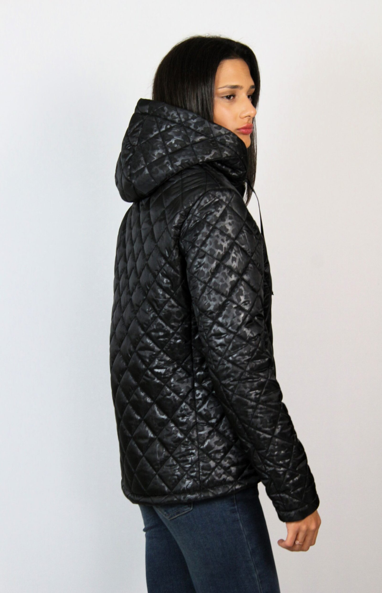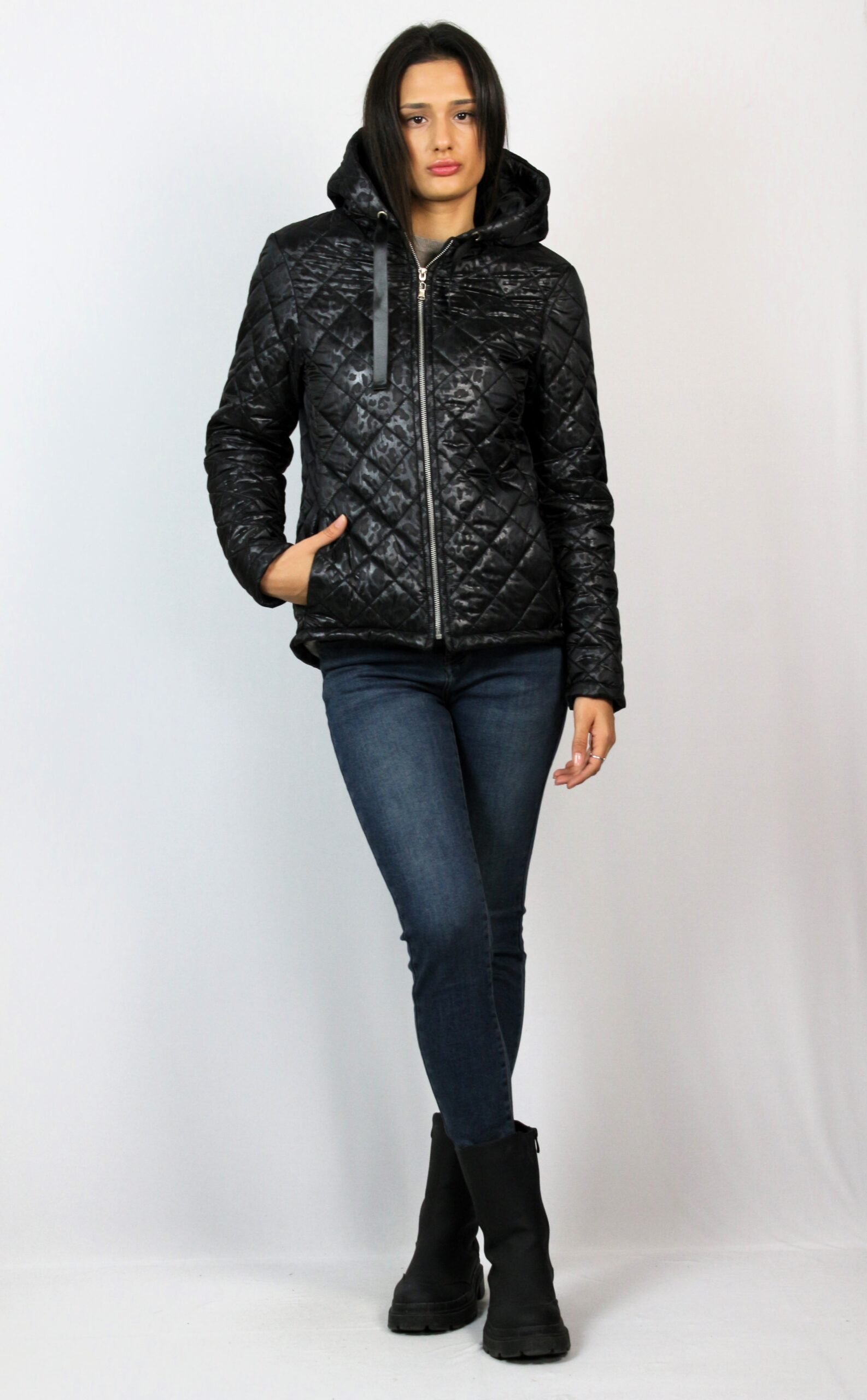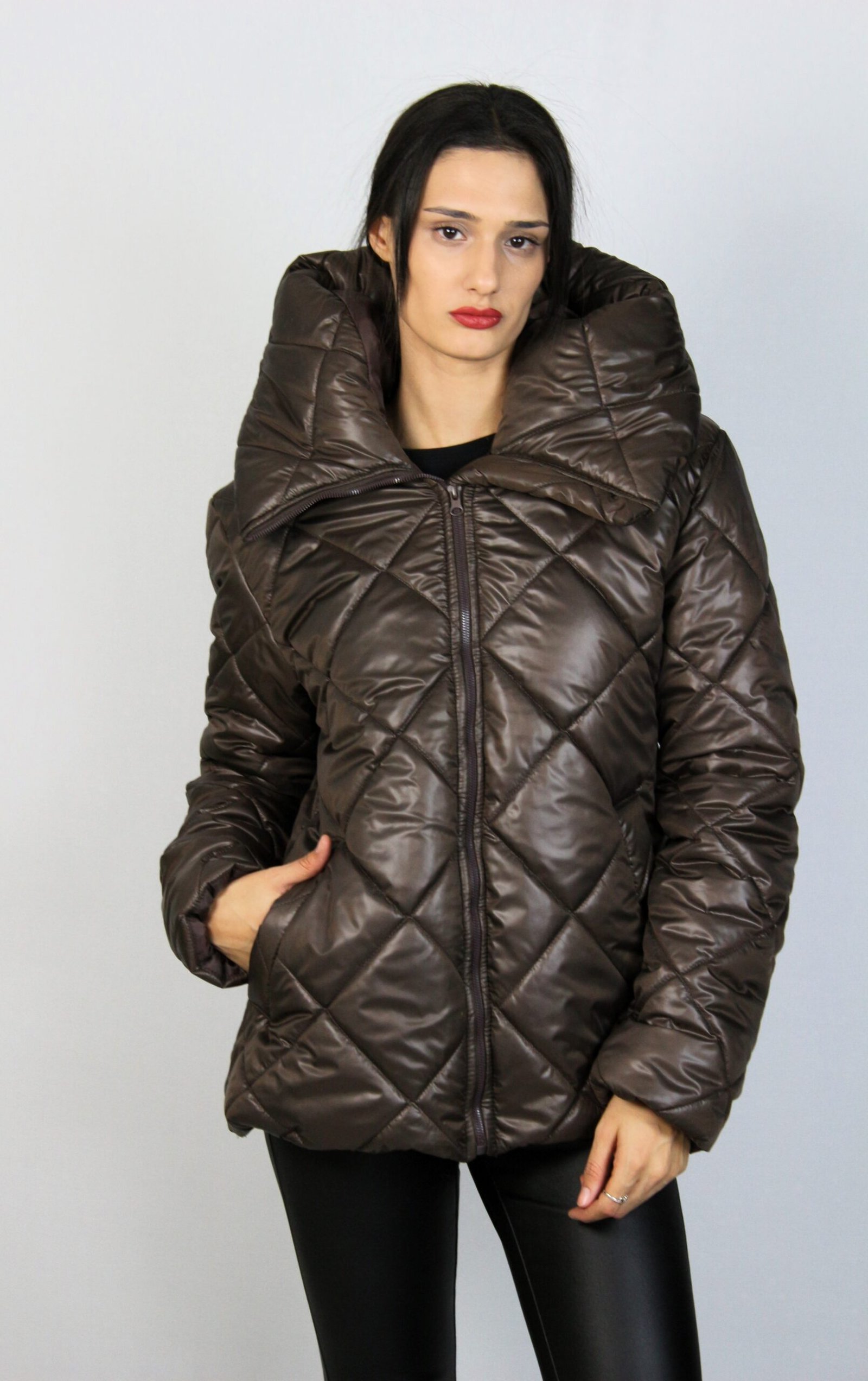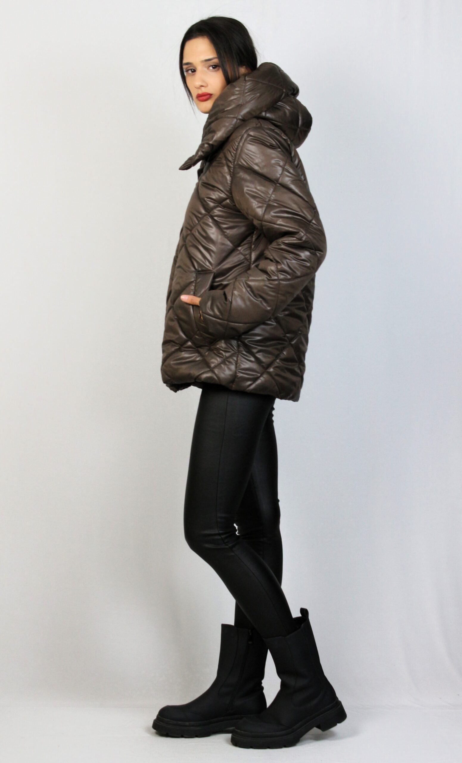 Асиметрично капитонирано яке със скрити джобове с цип и качулка, леко издължено в задната част. Има хастар.