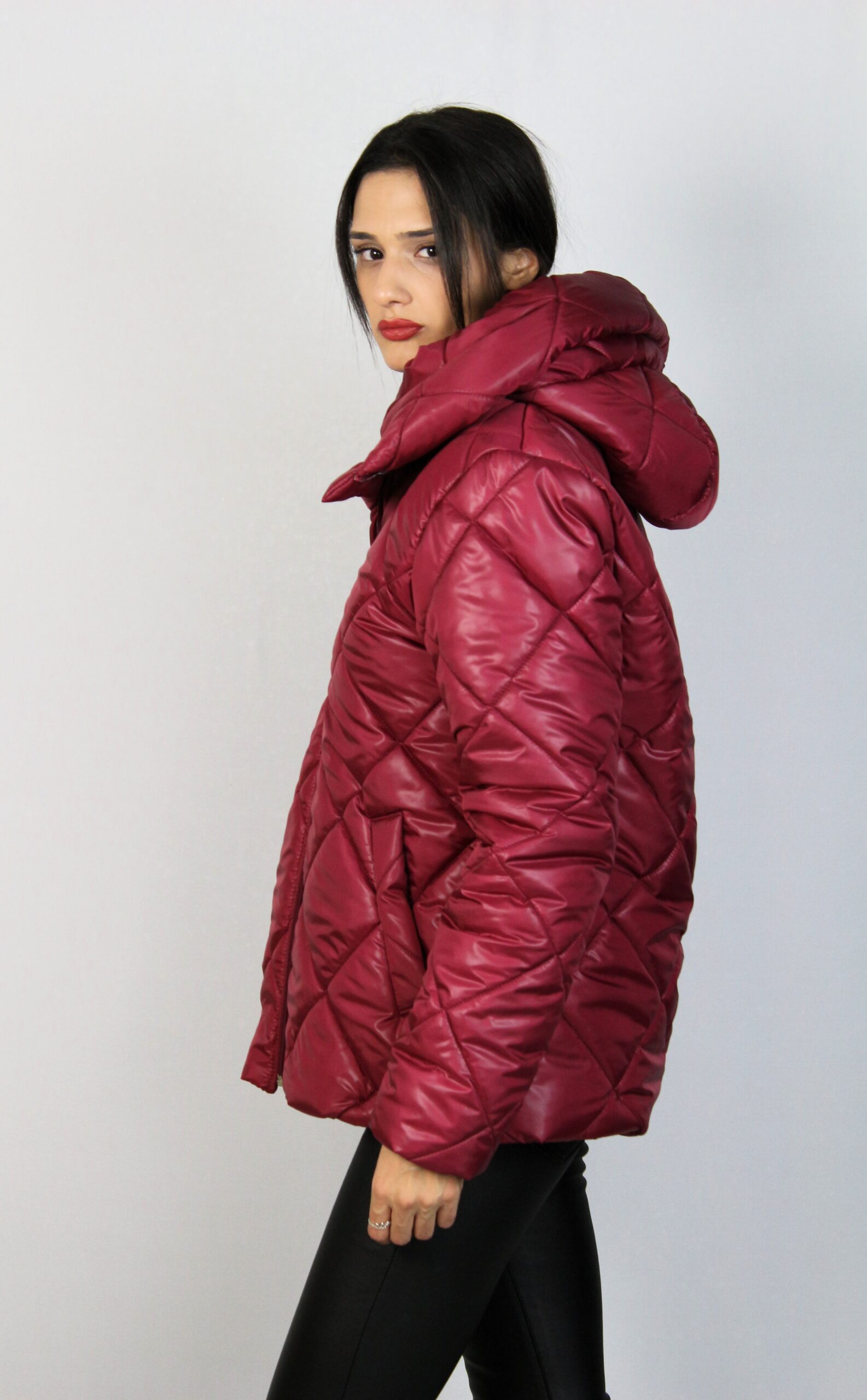 Ватирано яке с красива регулируема качулка и дълъг ръкав. Джобове с филетки. Закопчаване с цип отпред.