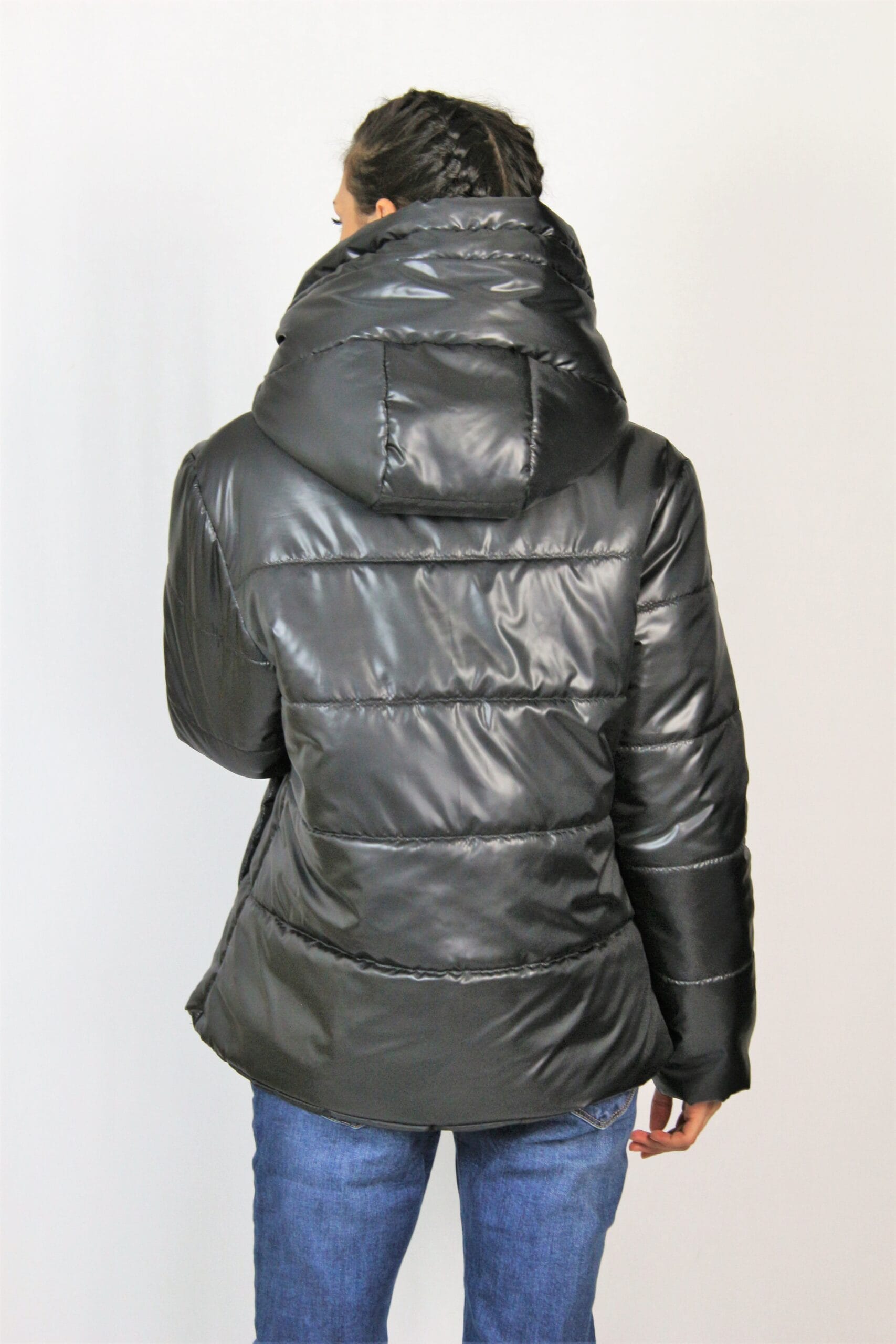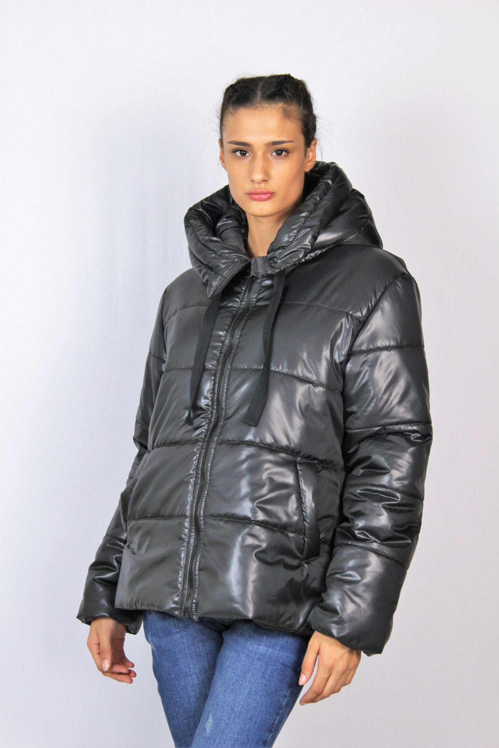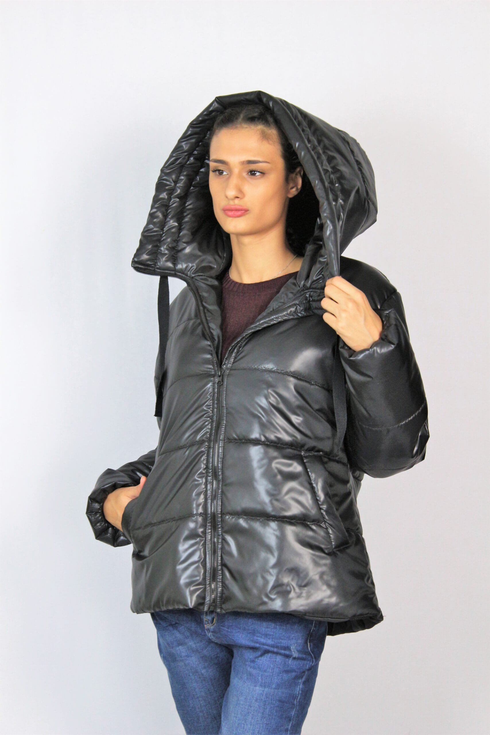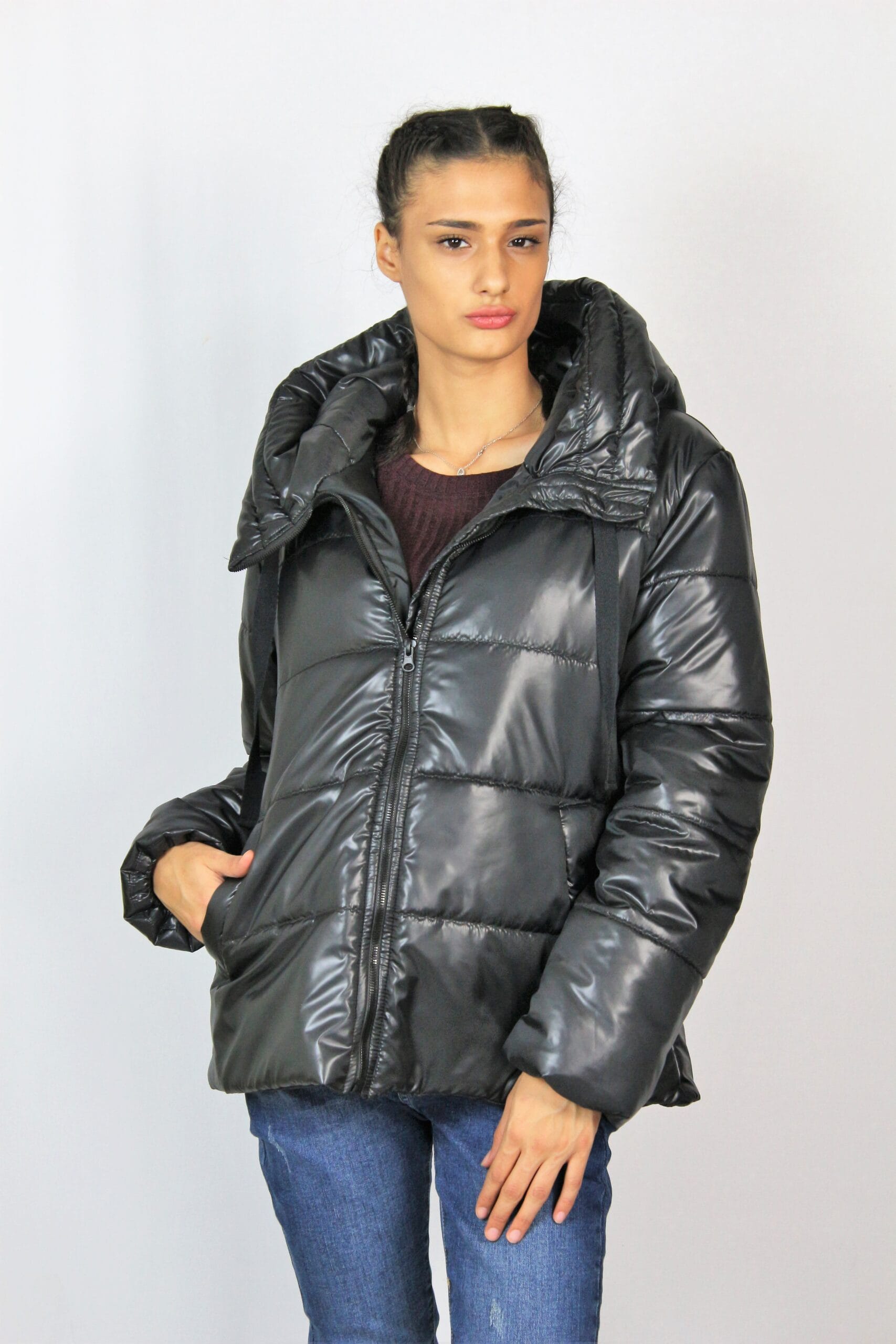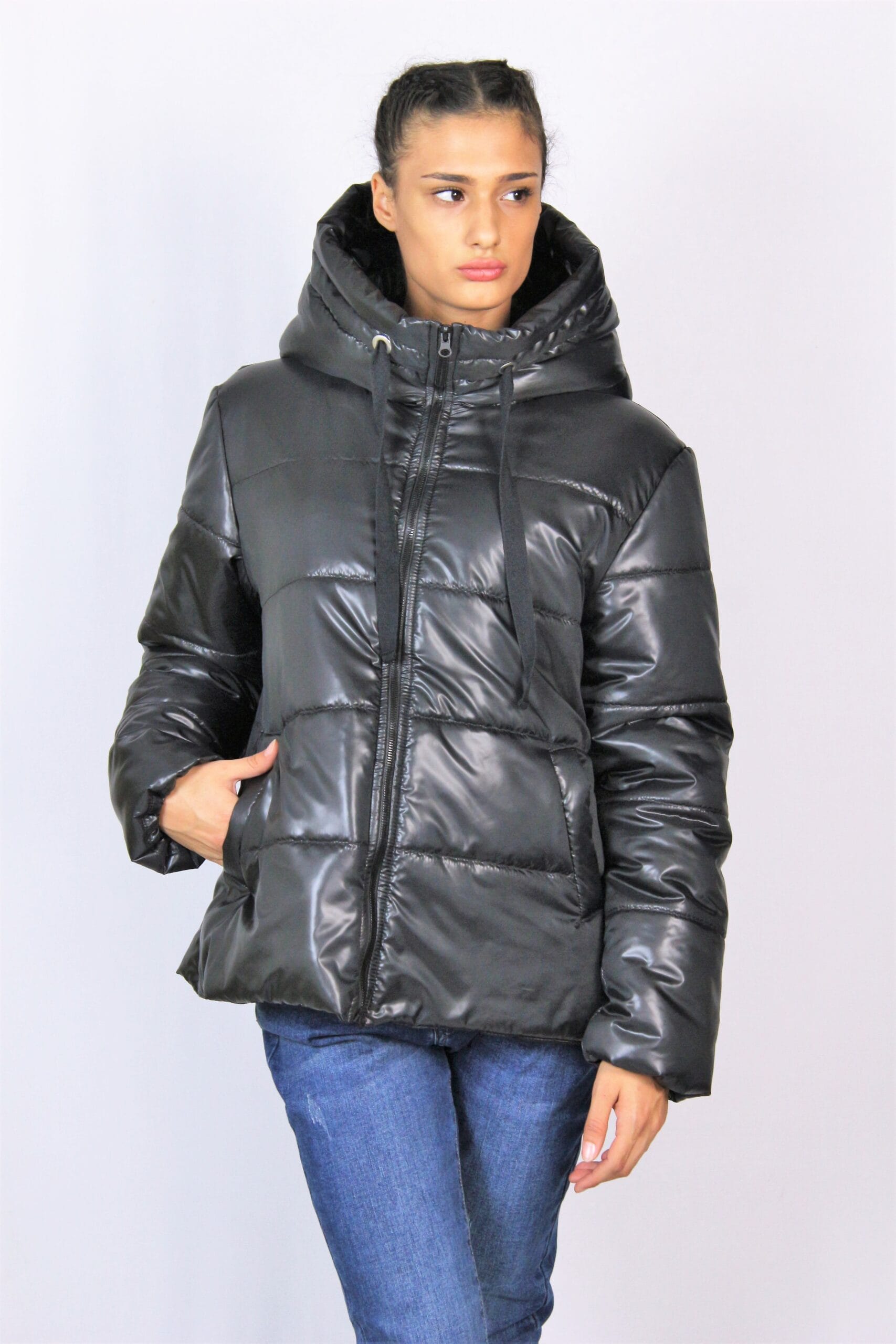 Ватирано яке с красива регулируема качулка и дълъг ръкав. Джобове с филетки. Закопчаване с цип отпред.